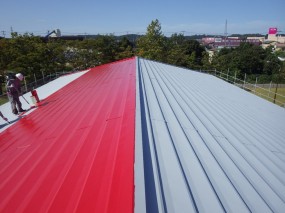 屋根の塗り替えをしています2 投稿日時: 2016/10/20 投稿者: 川口リファイン 屋根の塗り替えの続きです。 あまりにも発錆がひどかったので 弱溶剤形変性エポキシ樹脂塗料を2回塗りします。 1層目はブラウンで施工します。 1層目ブラウン完了です。 2層目はグレーです。 上塗りの色によって1層目と2層目の色を 変えたりします。 錆止め2層目完了です。 つづく・・・