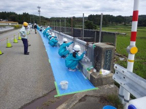 橋守隊2016 投稿日時: 2016/10/14 投稿者: 川口リファイン 昨日、奥能登で子供たちに橋を塗装させる 橋守隊という行事を行いました。 現場までかなり距離があるので マイクロバスにて送迎しました。 一列に並んで高欄を塗装します。 一人およそ2m(2㎡程度)塗装します。 そこらじゅうで記念撮影をしています。 塗装完了です。 全員で記念写真「ハイチーズ」 大変お疲れ様でした。